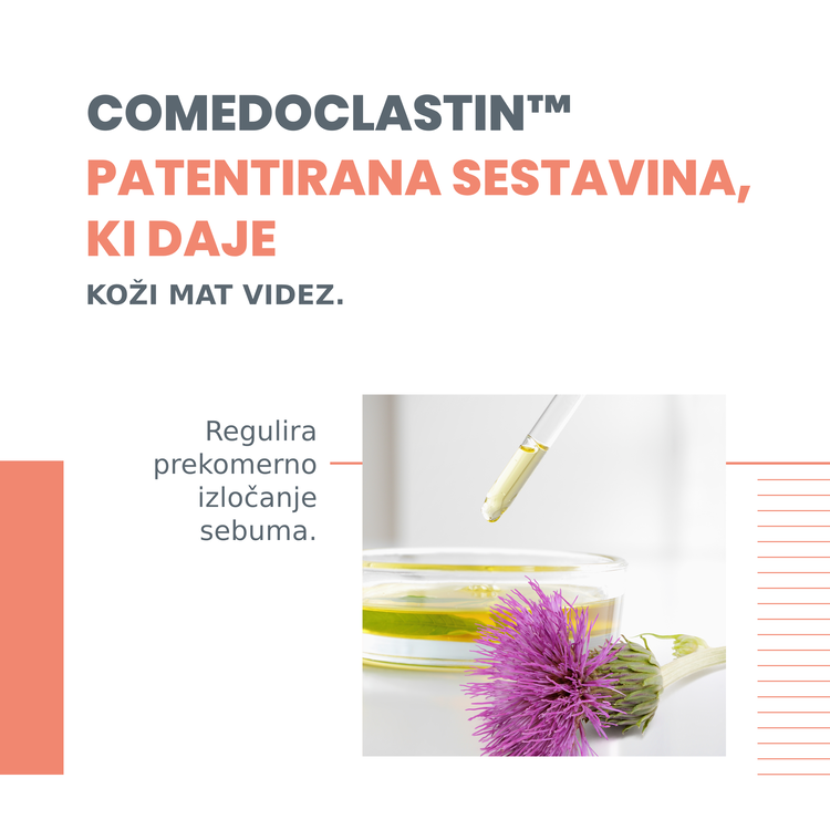 Vsebuje inovativno sestavino COMEDOCLASTIN™ s patentiranimi lastnostmi****. Pridobljena je iz ekstrakta semen pegasta badlja (Silybummarianum).Deluje tako, da uravnava izločanje sebuma in spremeni njegovo sestavo. Tako pripomore k zmanjšanemu nastajanju mikrokomedonov in omeji njihov razvoj.