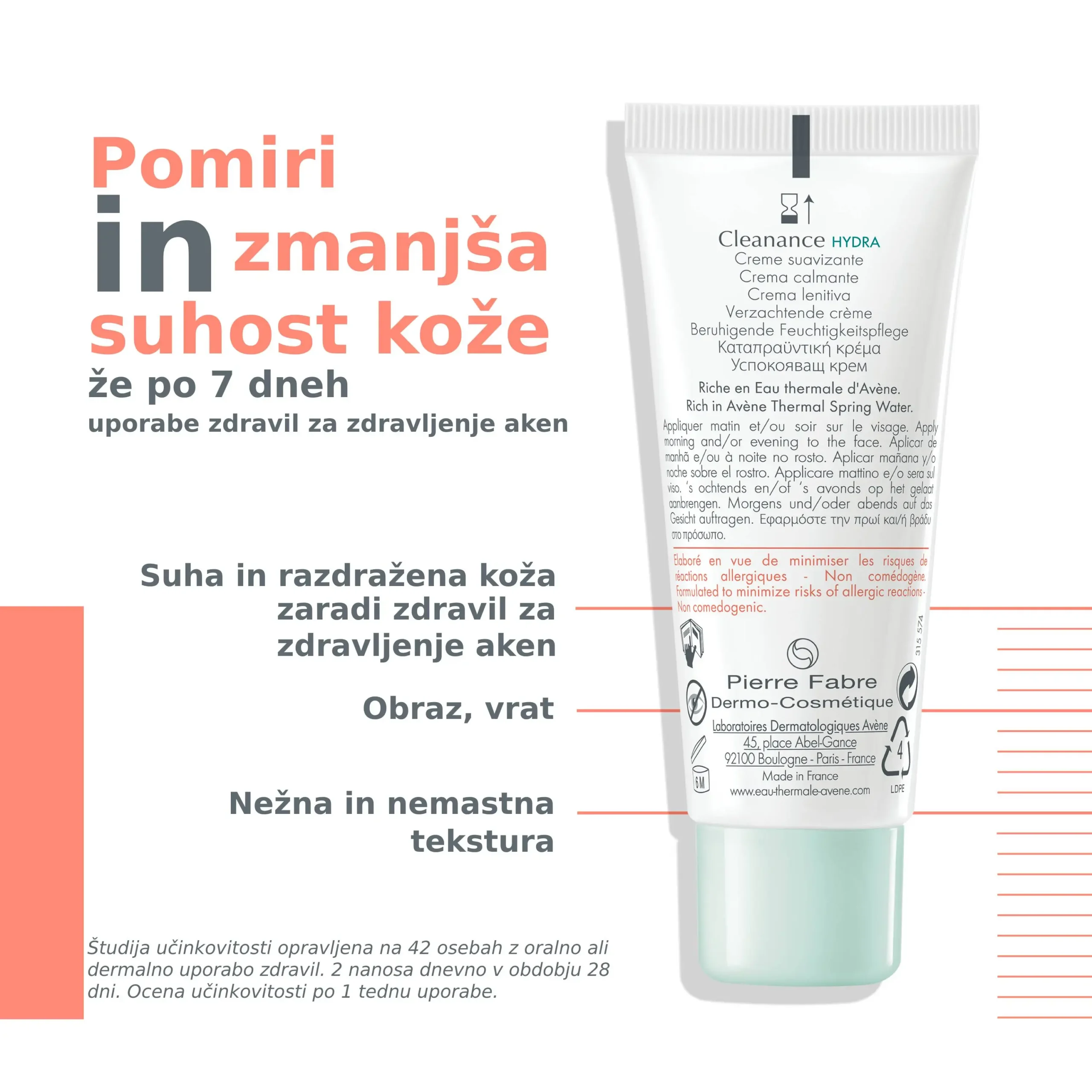 Avène Cleanance HYDRA pomirjujoča krema, pomirja, vlaži, hrani in blaži negativne učinke zdravil za zdravljenje aken, ki sušijo in dražijo kožo. Daje občutek udobja na koži. Kremna, nemastna tekstura bogata z vlažilnimi sestavinami.