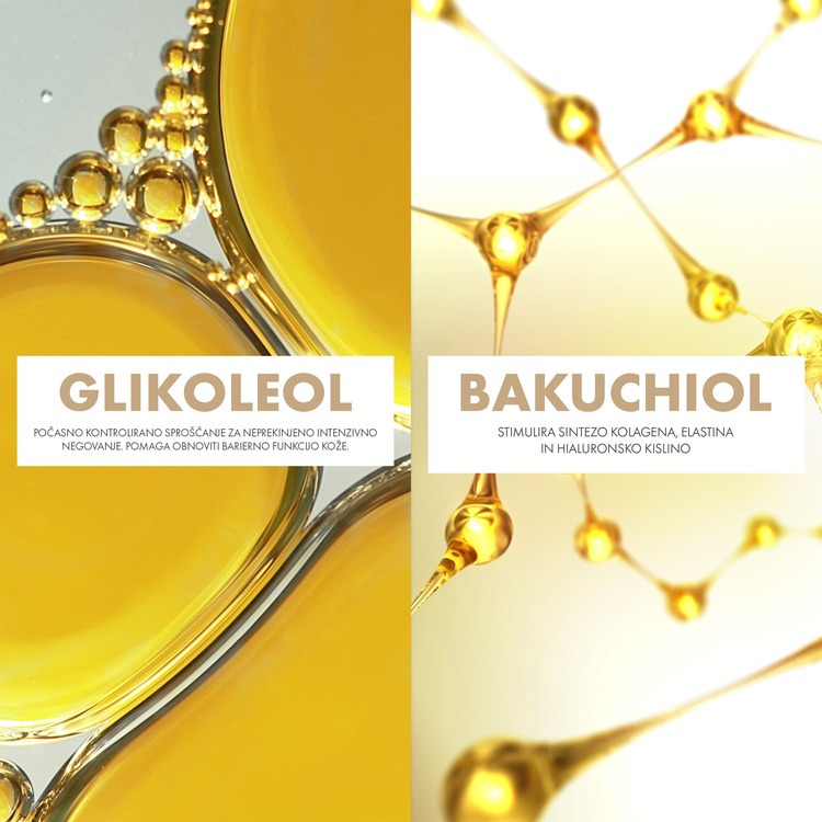 ● bakuchiol (1 %) – rastlinska alternativa retinolu, ki poveča sintezo kolagena in elastina za ohranjenje volumna kože,