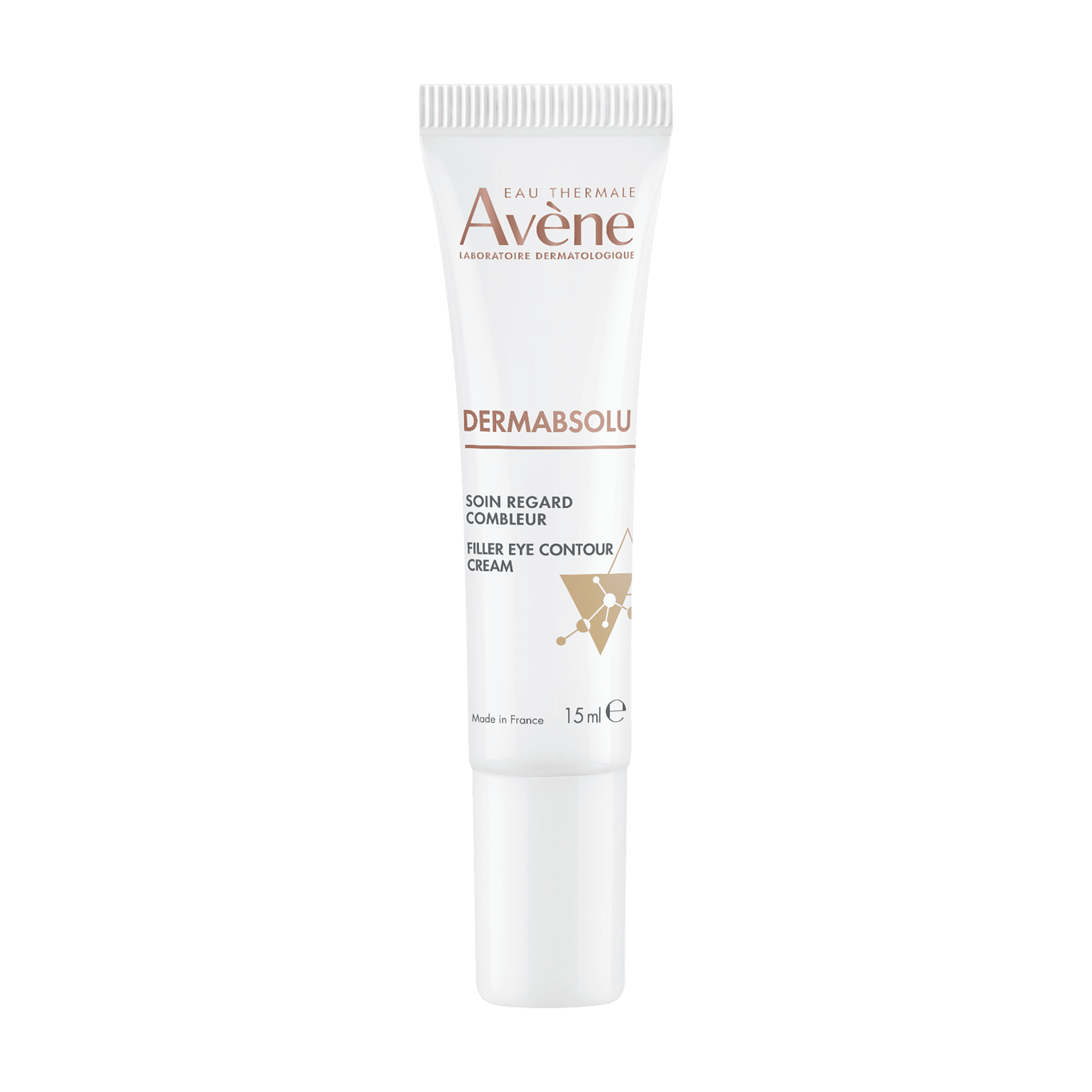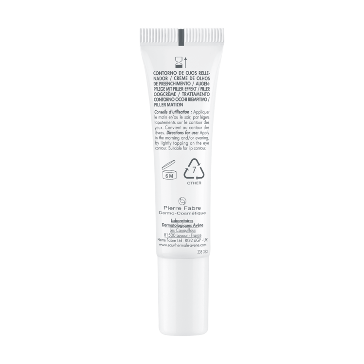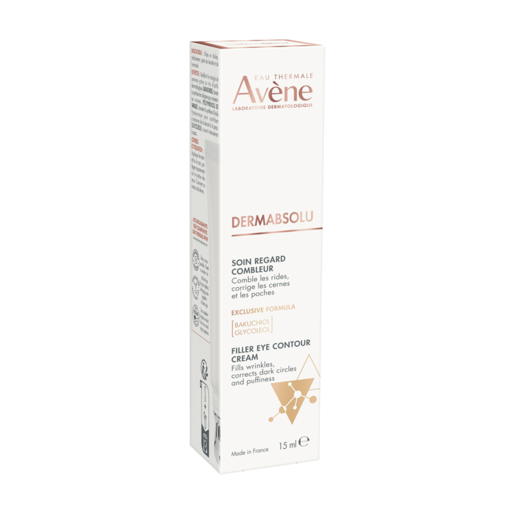Avène DERMABSOLU FILLER krema za predel okoli oči zapolni gube, korigira podočnjake in zabuhlost. Formulirana s triom aktivnih sestavin za preoblikovanje, vključno z 1 % bakuchiolom, ki je enako učinkovit kot retinol, vendar z boljšo toleranco in rastlinskega izvora. Poveča sintezo kolagena za ohranjanje volumna kože. Ta nega pomaga na novo opredeliti mladostni trikotnik. Vrača obliko trikotnika mladosti zahvaljujoč trem dermatološkim sestavinam: bakuchiol, glikoleol in polifenoli vanilije. Izdelek je preizkušen na občutljivi koži. Formula je veganska.