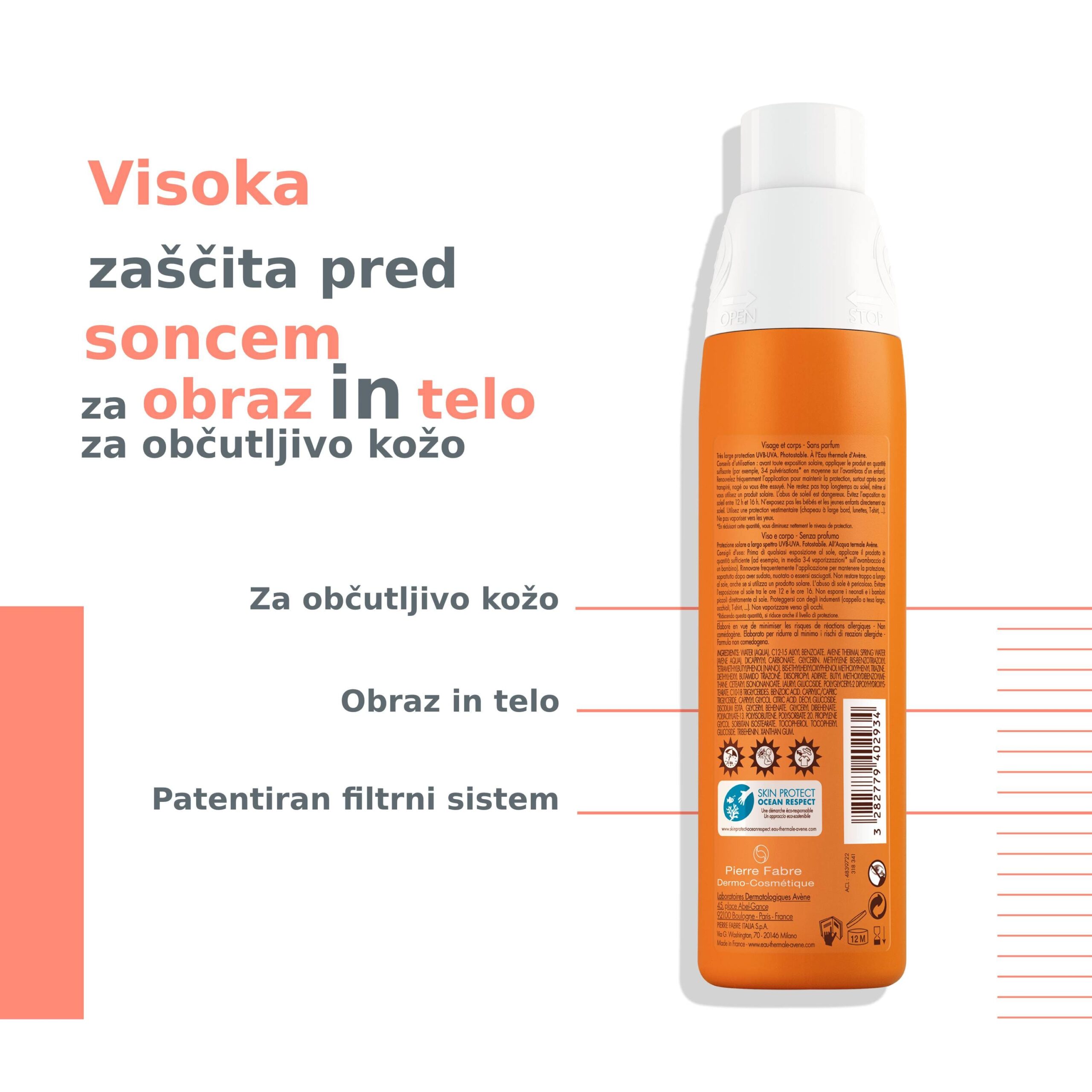 Avène Pršilo za zaščito pred soncem SPF 30. Visoka zaščita pred soncem za občutljivo kožo.