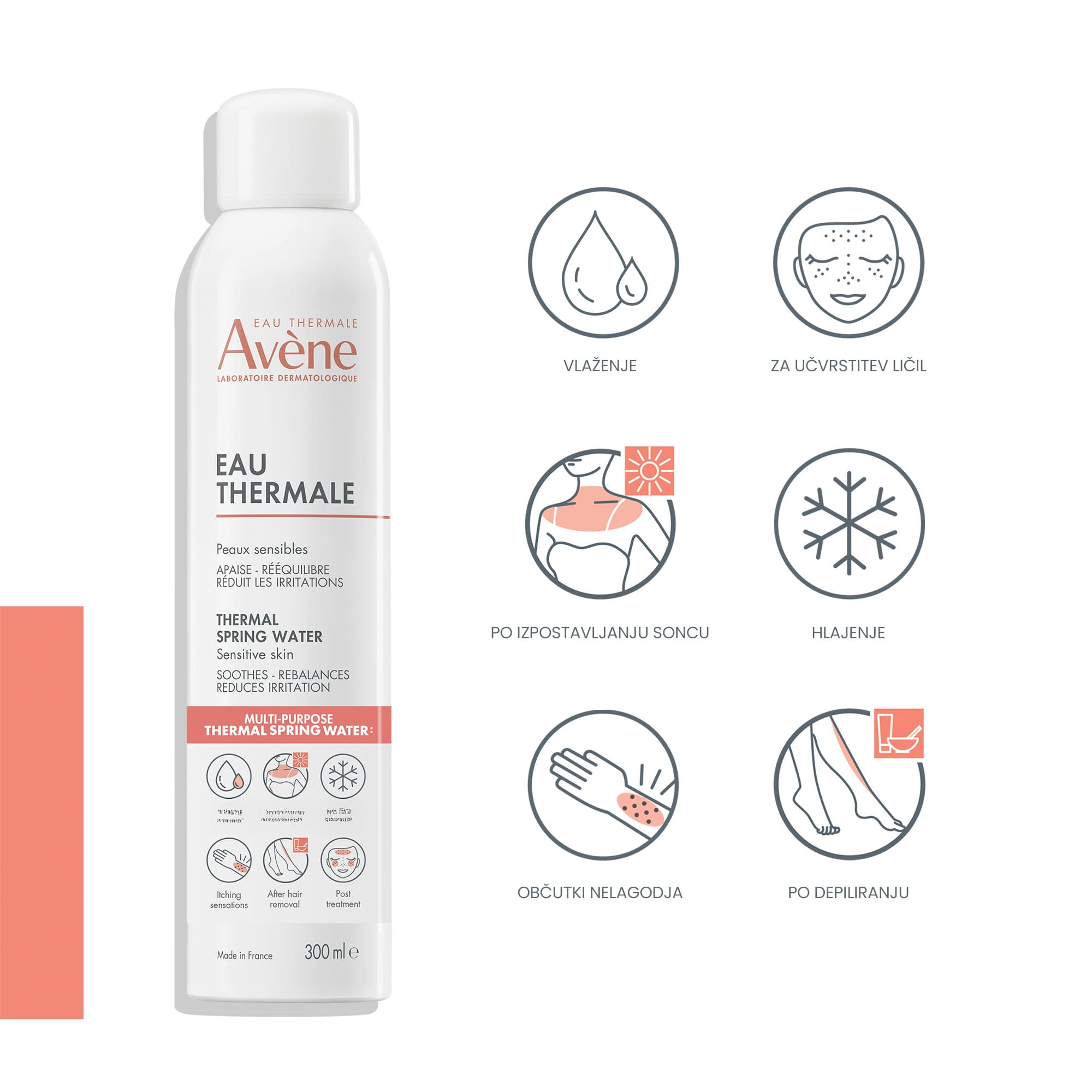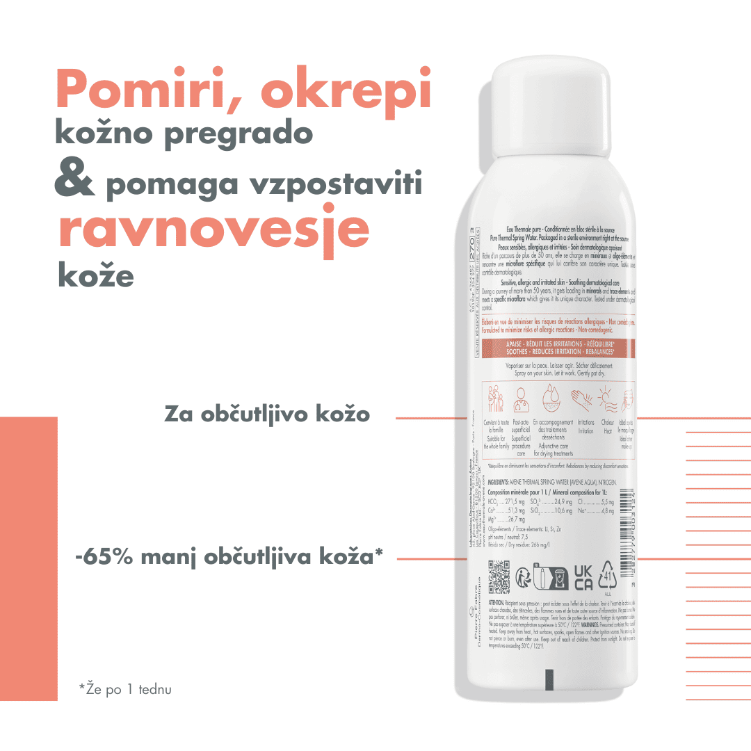 Avène termalna izvirska voda s svojim blagodejnim delovanjem je vir olajšanja za občutljivo kožo. Pršilo s termalno izvirsko vodo Avène pomirja, krepi in obnavlja občutljivo ali razdraženo kožo, ki kaže znake neugodja, rdečico, srbenje in občutek zategovanja.