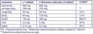 Prehransko dopolnilo s kremenko (silicijeva prst), kalcijem, magnezijem, biotinom, cinkom in bakrom.