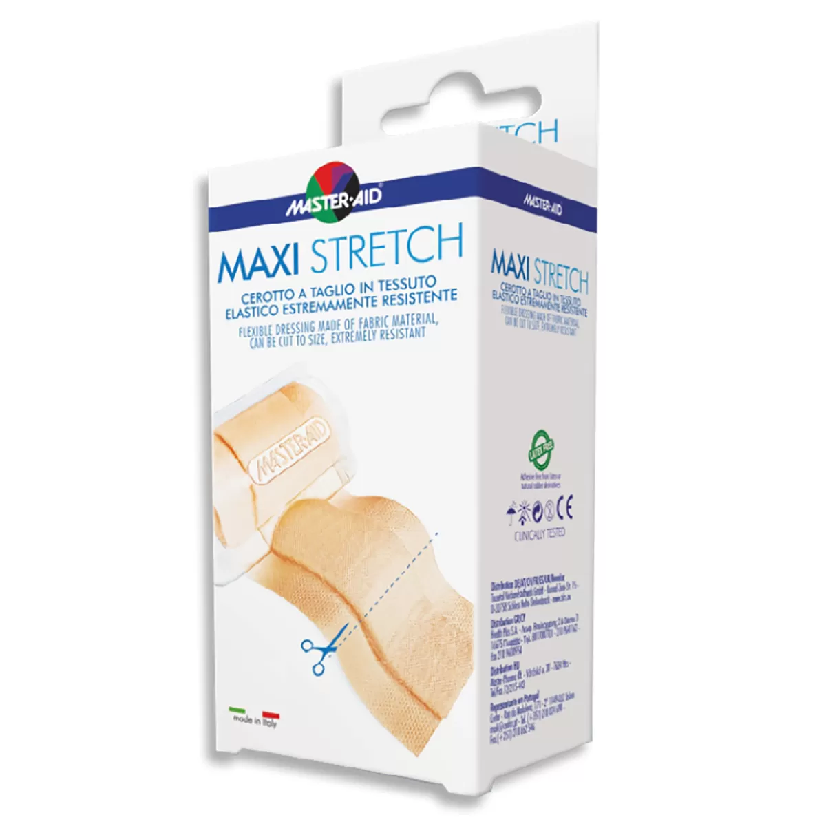 Medicinski pripomoček Master Aid Maxi stretch je obliž iz odporne, elastične tkanine kožne barve. Blazinica z visoko vpojnostjo. Obliž se za higiensko shranjevanje nahaja v plasti- čnem ovoju. Hipoalergeno lepilo. Še posebej priporočljivo za nežno, občutljivo in razdraženo kožo. Odstranitev je neboleča. Lepilo, občutljivo na toploto in pritisk.