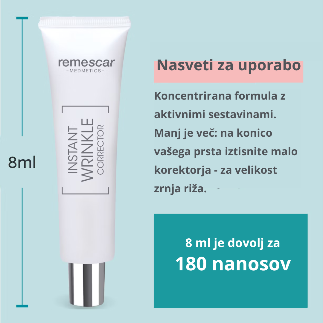 Remescar instant korektor gub je posebej zasnovan, da samo v nekaj minutah korigira manjše gube na občutljivem področju okoli oči, med obrvmi ter okoli ust in nosa.