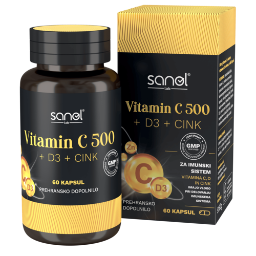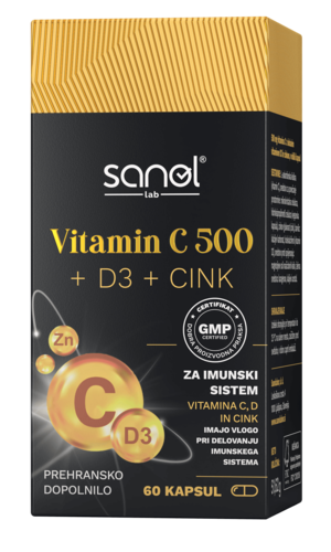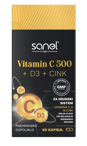 Sanol LAB Vitamin C 500 + D3 + cink je prehransko dopolnilo, namenjeno podpori imunskega sistema.1