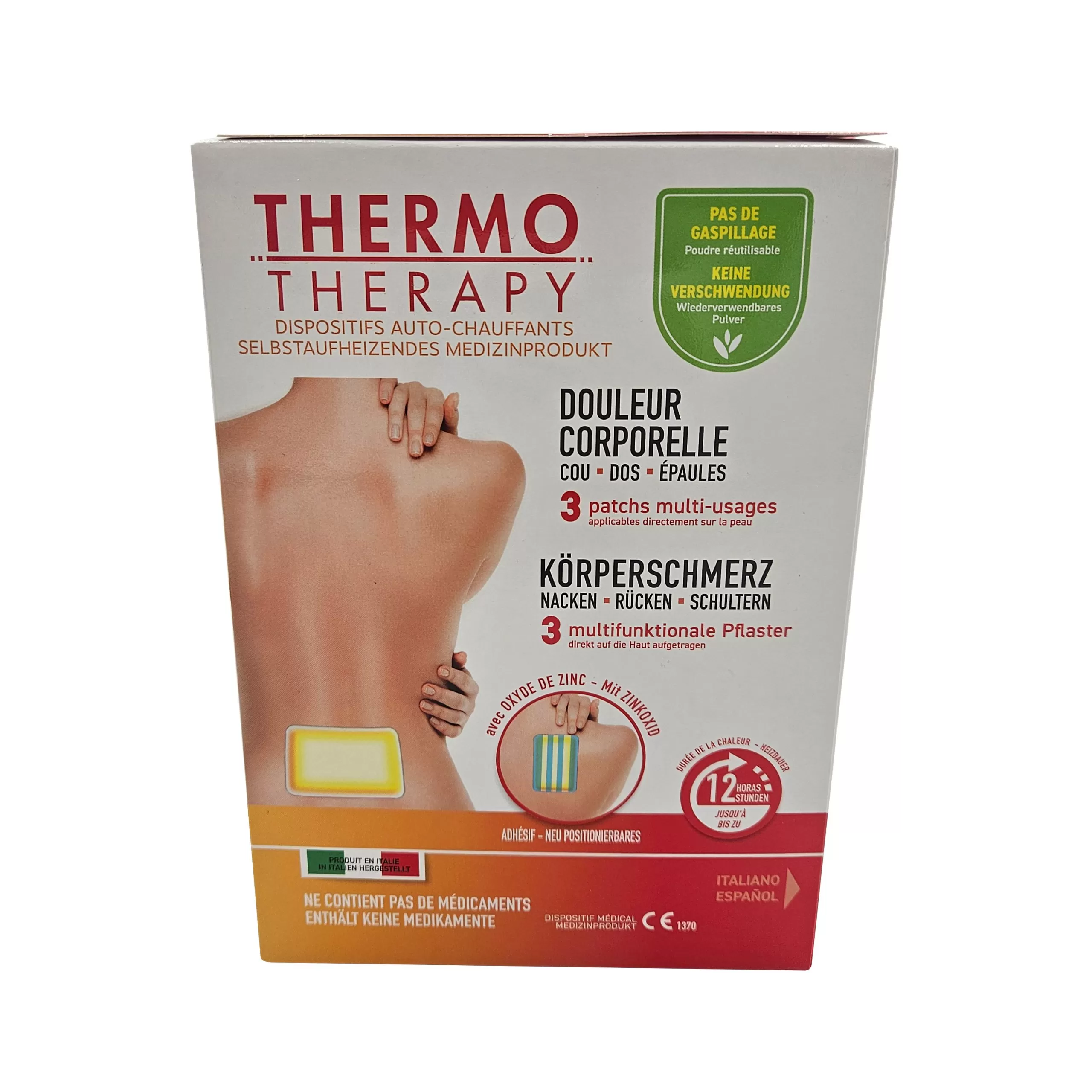 Thermo Therapy univerzalni obliž je medicinski pripomoček pri bolečinah v hrbtu in ramenih. V trenutku, ko odprete embalažo, se začne obliž v stiku z zrakom postopoma segrevati na ustrezno temperaturo zaradi toplotnega delovanja. Ko obliž namestite na prizadeto mesto, se bo toplota enakomerno razporedila v globino telesa. Nova oblika in posebno lepilo na osnovi cinkovega oksida zagotavljata največjo mero udobja in omogočata kar najboljši izkoristek lastnosti obliža.